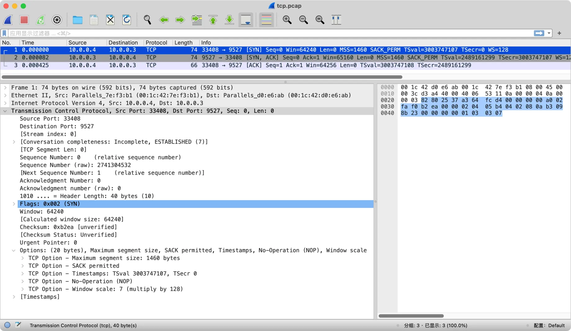 1 2 3 4 5 6 7 8 9 10 11 12 13 14 15 16 17 18 # vm-1 $ sudo tcpdump -s0 -X -nn "tcp port 9527" -w tcp.pcap --print tcpdump: listening on enp0s5, link-type EN10MB (Ethernet), snapshot length 262144 bytes 13:15:40.768222 IP 10.0.0.4.33408 > 10.0.0.3.9527: Flags [S], seq 2741304532, win 64240, options [mss 1460,sackOK,TS val 3003747107 ecr 0,nop,wscale 7], length 0 0x0000: 4500 003c d3a4 4000 4006 5311 0a00 0004 E..<..@.@.S..... 0x0010: 0a00 0003 8280 2537 a364 fcd4 0000 0000 ......%7.d...... 0x0020: a002 faf0 b2ea 0000 0204 05b4 0402 080a ................ 0x0030: b309 8b23 0000 0000 0103 0307 ...#........ 13:15:40.768304 IP 10.0.0.3.9527 > 10.0.0.4.33408: Flags [S.], seq 1187094817, ack 2741304533, win 65160, options [mss 1460,sackOK,TS val 2489161299 ecr 3003747107,nop,wscale 7], length 0 0x0000: 4500 003c 0000 4000 4006 26b6 0a00 0003 E..<..@.@.&..... 0x0010: 0a00 0004 2537 8280 46c1 a121 a364 fcd5 ....%7..F..!.d.. 0x0020: a012 fe88 1435 0000 0204 05b4 0402 080a .....5.......... 0x0030: 945d 9653 b309 8b23 0103 0307 .].S...#.... 13:15:40.768647 IP 10.0.0.4.33408 > 10.0.0.3.9527: Flags [.], ack 1, win 502, options [nop,nop,TS val 3003747108 ecr 2489161299], length 0 0x0000: 4500 0034 d3a5 4000 4006 5318 0a00 0004 E..4..@.@.S..... 0x0010: 0a00 0003 8280 2537 a364 fcd5 46c1 a122 ......%7.d..F.." 0x0020: 8010 01f6 c80b 0000 0101 080a b309 8b24 ...............$ 0x0030: 945d 9653 .].S