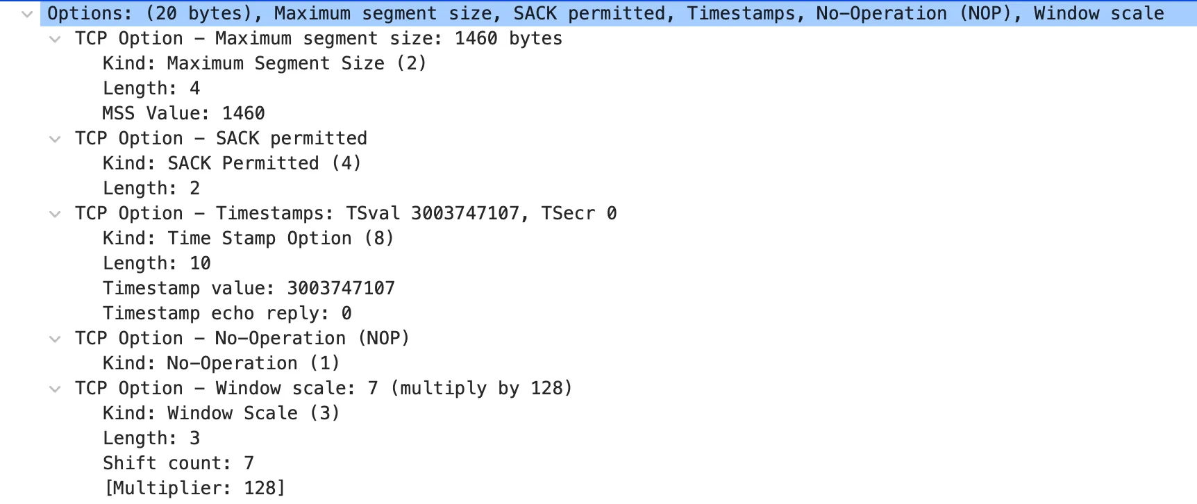 第五个选项(3)表示 TCP 窗口缩放(RFC1323 )。TCP 协议头的窗口大小由 2 字节表示(最大 65535 字节),但实际上内核默认的 TCP 缓存区大小比这个值大很多: